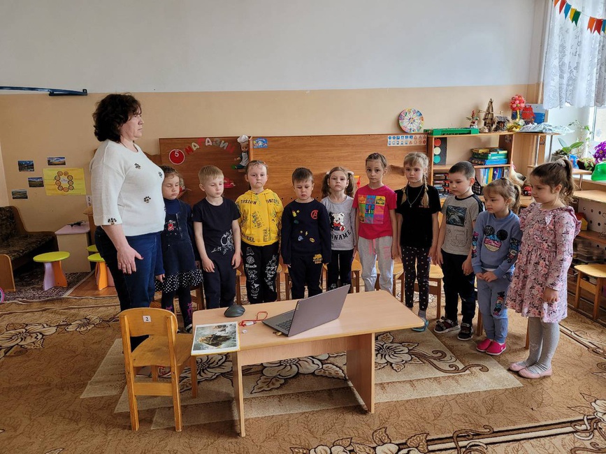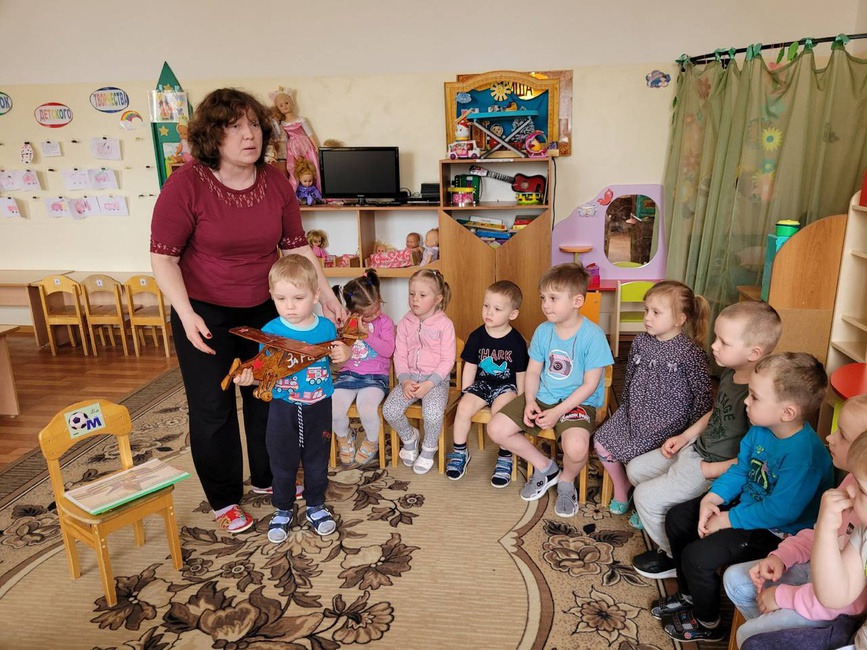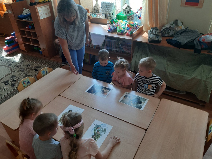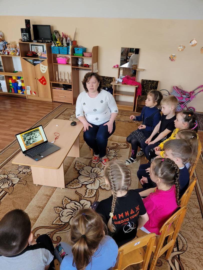26 апреля с детьми младшей разновозрастной группы была проведена беседа о "Курской битве": рассматривали репродукции о войне, награды участников великой победы, повторили военные профессии, технику времён войны, прослуши песню "Вечный огонь".