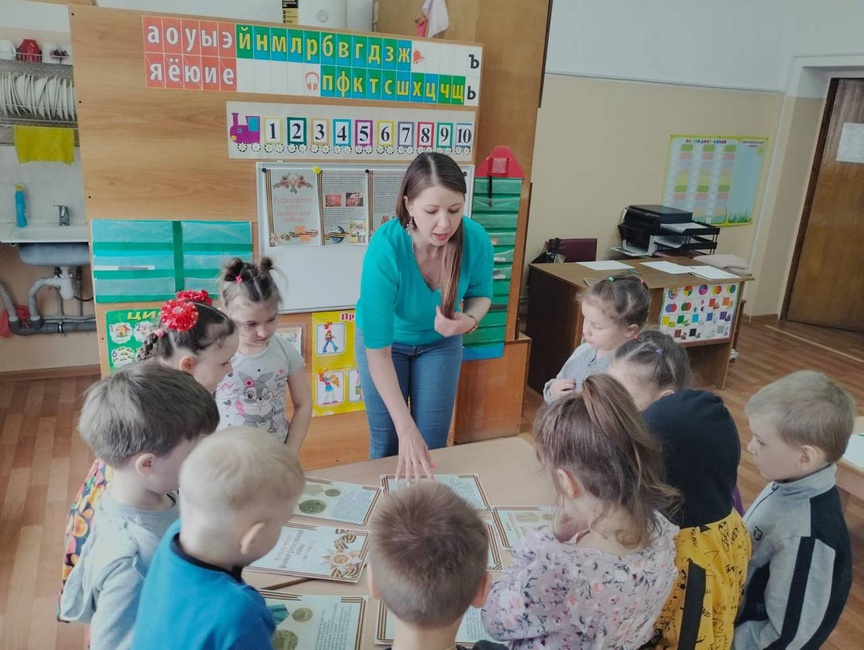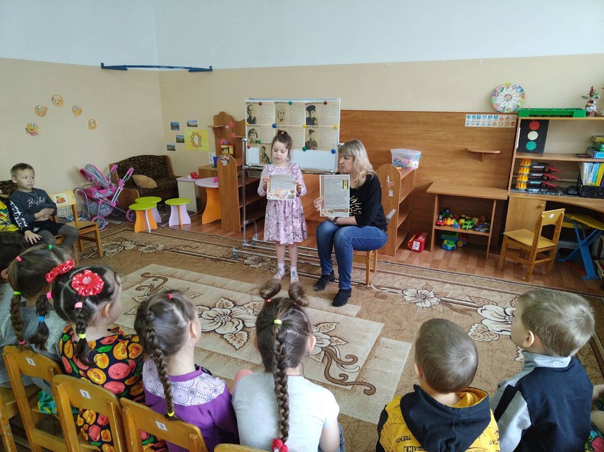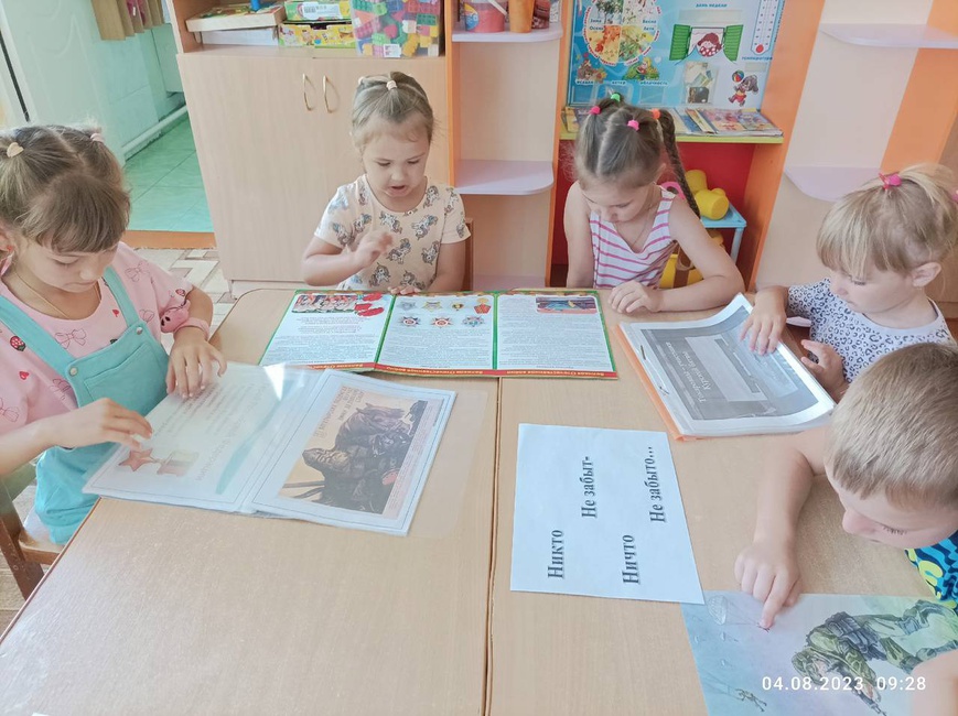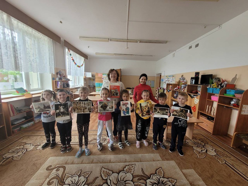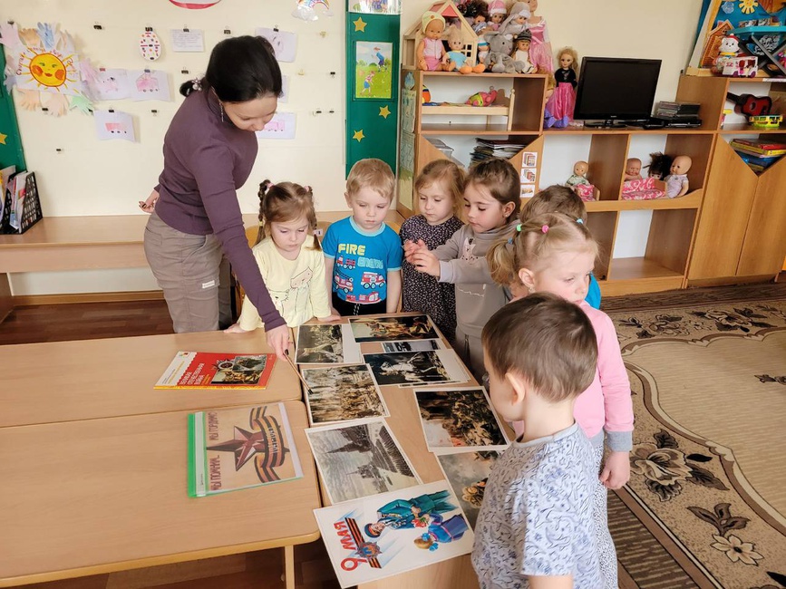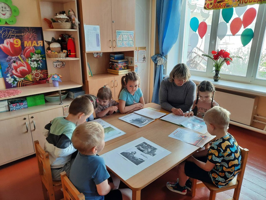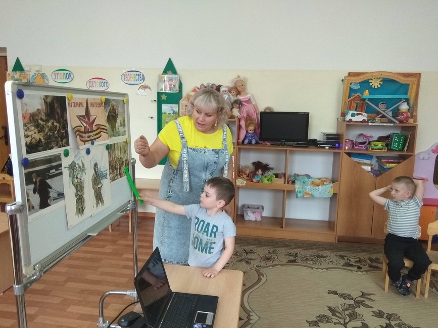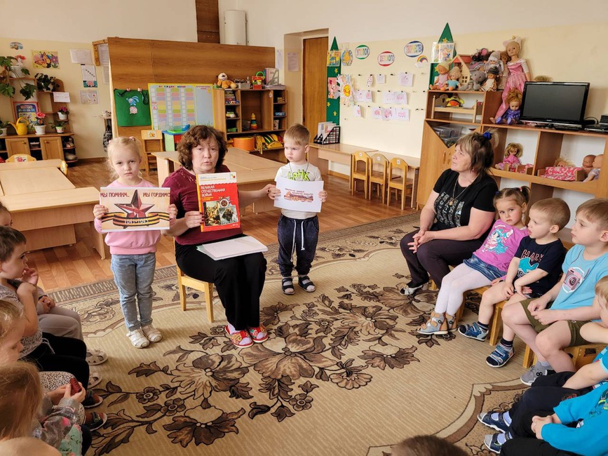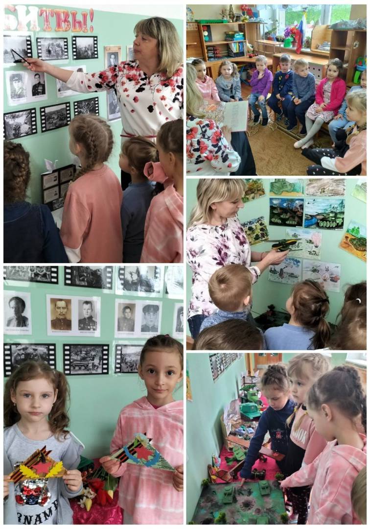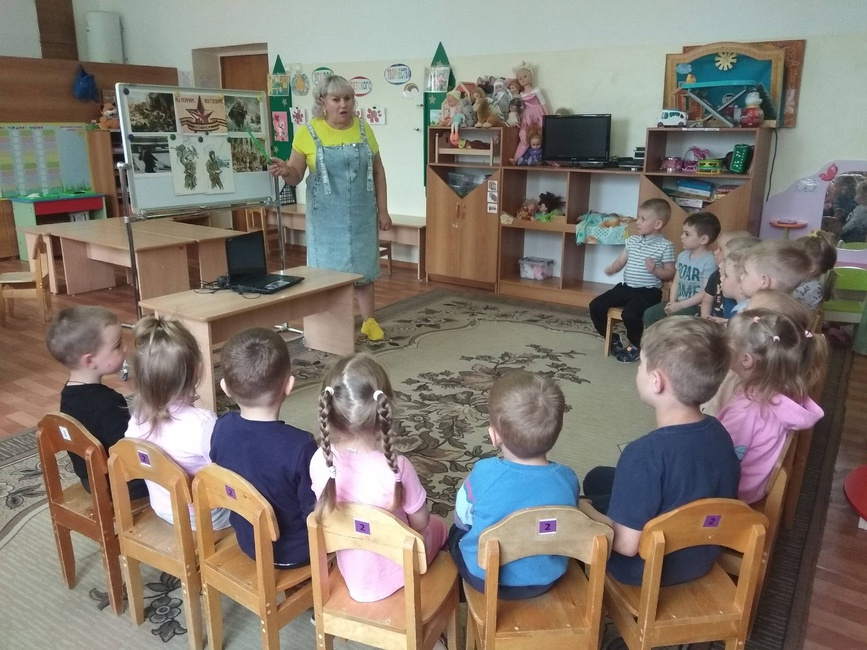 В преддверии Дня Победы с детьми старшей дежурной группы была проведена беседа о великом празднике, о людях, отдавших жизни за свободу нашей Родины. Воспитанники с интересом прослушали песни времён Великой Отечественной войны. Познакомились с содержанием произведения Сергея Маршака " Были для детей" . Рассмотрели материалы организованной в помещении детского сада выставки- вернисажа " 80 лет Курской битвы".