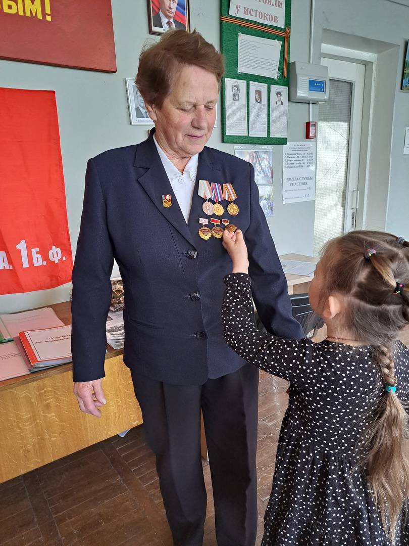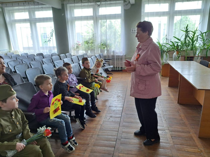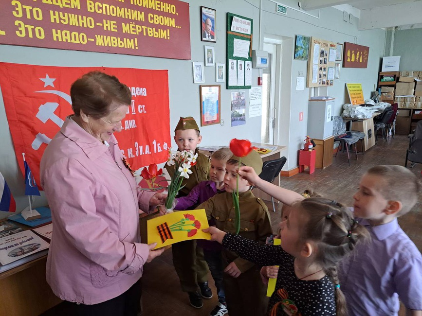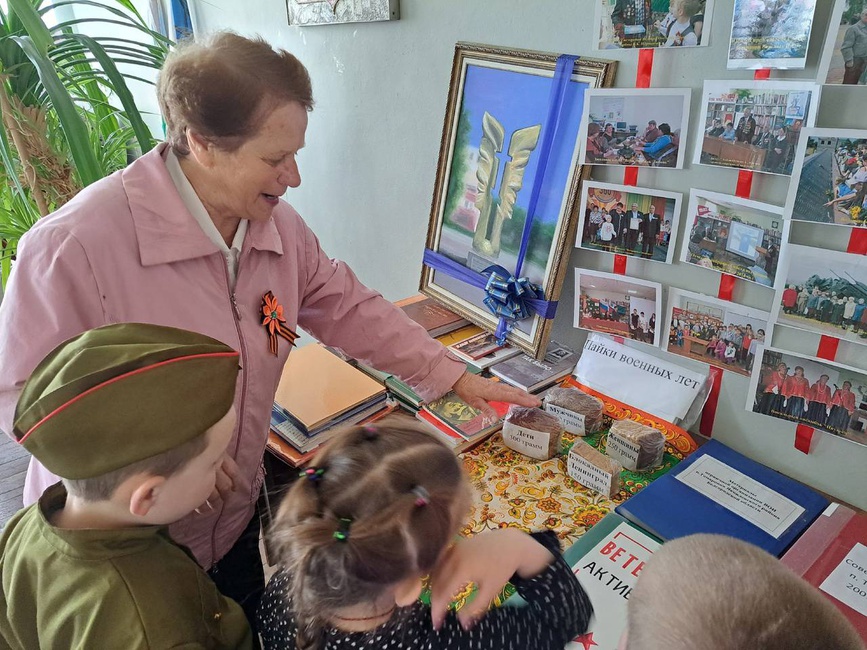 Надежда Гаврииловна провела экскурсию в комнате совета ветеранов по выставке - экспозиции воинской славы. Дети узнали много из жизни прадедов, о боях, гремевших в нашем поселке в августе 1943 года, о солдатах погибших во время освобождения п.Томаровка. Поделилась своими воспоминаниями о войне, о тяжелом военном времени,когда даже маленьким детям приходилось работать. Ребята внимательно слушали рассказ, задавали вопросы о ВОв.