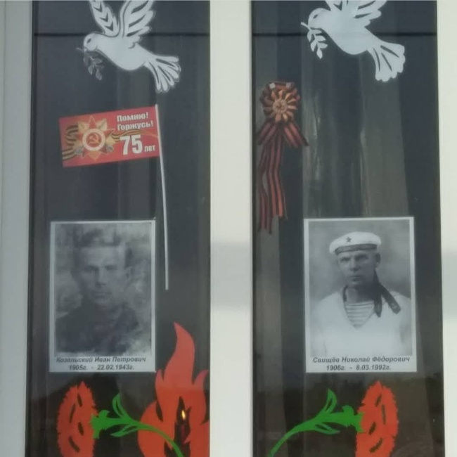 На своем окне, в первую очередь, я представил героев нашей семьи. Это мои прадеды-Скрыпченко Митрофан Романович и Кудрявцев Николай Терентьевич, которые отважно защищали свою Родину от фашистов.