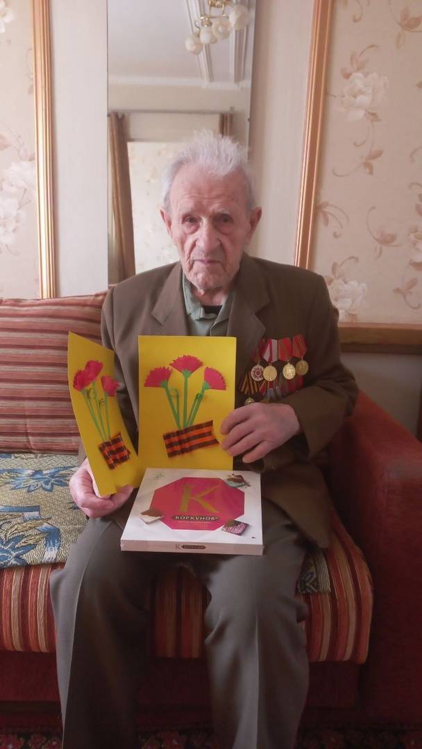 Так же воспитанники посетили ветерана Великой Отечественной войны Ширяева Николая Прохоровича. Передали ему сладости и свои поделки с изображением алой гвоздики ,которая является олицетворением доблести и мужества.